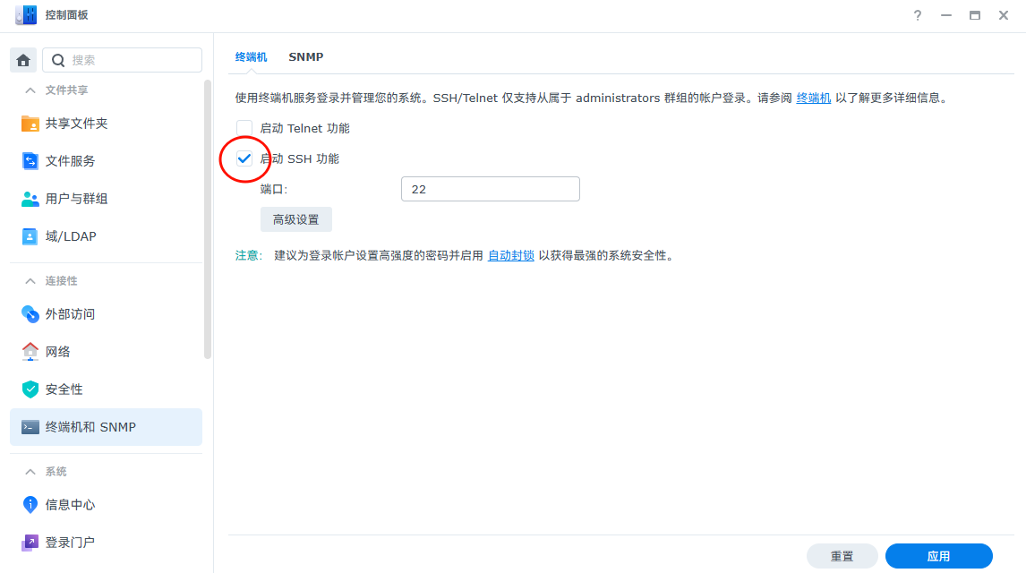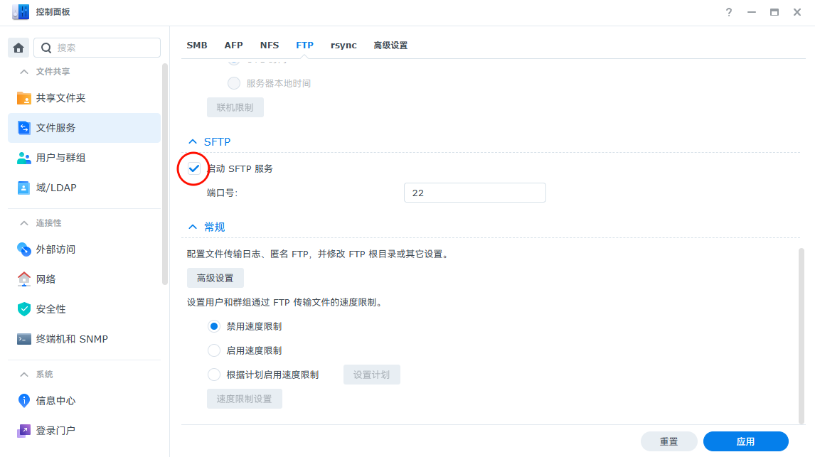打开群晖控制面板依次打开ssh以及sftp,端口默认22即可