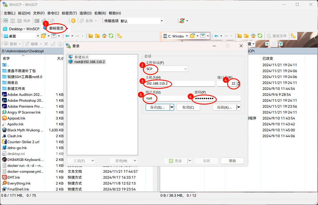 注意:文件协议一定要选择SCP否则会提示无法连接