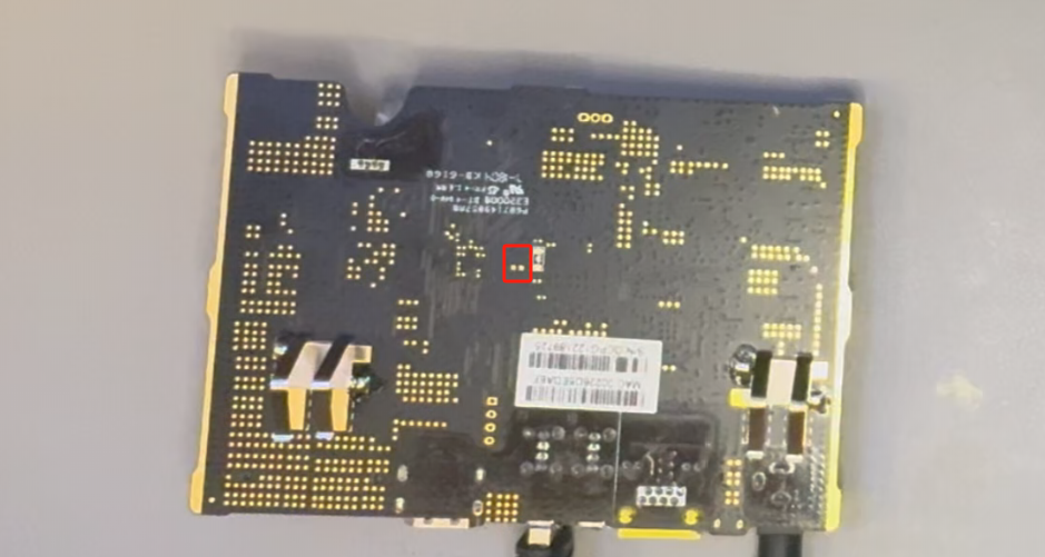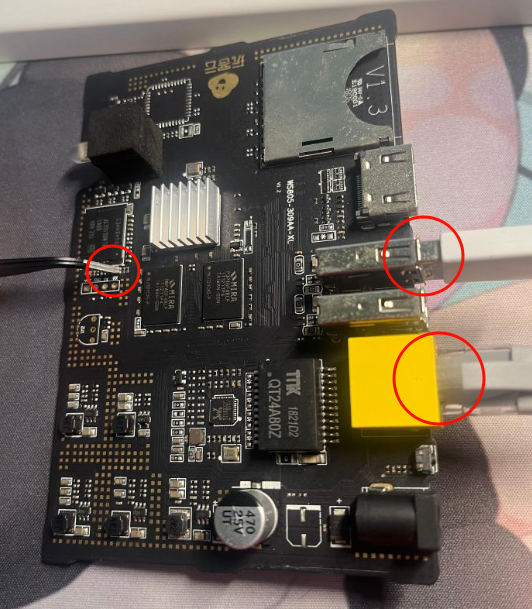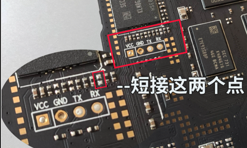 2.插好网线,将双公头刷机线一头接在电脑USB接口上另一头接在玩客云靠近HDMI接口的那个USB接口上,然后用镊子接触主板上的这两个短接点