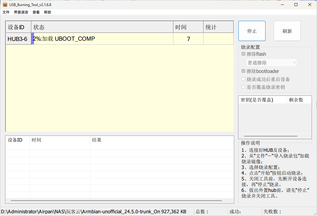 然后我们双击里面的刷机工具里的Amlogic USB Burning Tool v2.1.6.8.exe安装APP,安装好了之后打开,然后选择右上角的导入固件,选择解压后的Armbian开头的.img文件,然后导入,导入完了之后点击开始,先放在那里,等会再用。