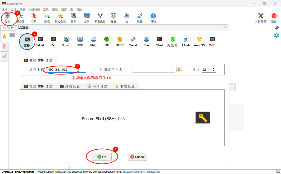 2.然后接下来需要使用 SSH 进行远程,这里我使用的是 MobaXterm 来进行 SSH 远程